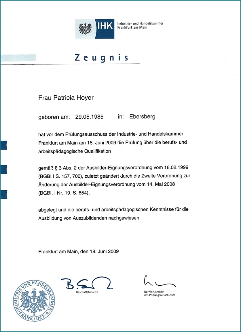 Ausbilder-Eignungszeugnis seit 18. Juni 2009