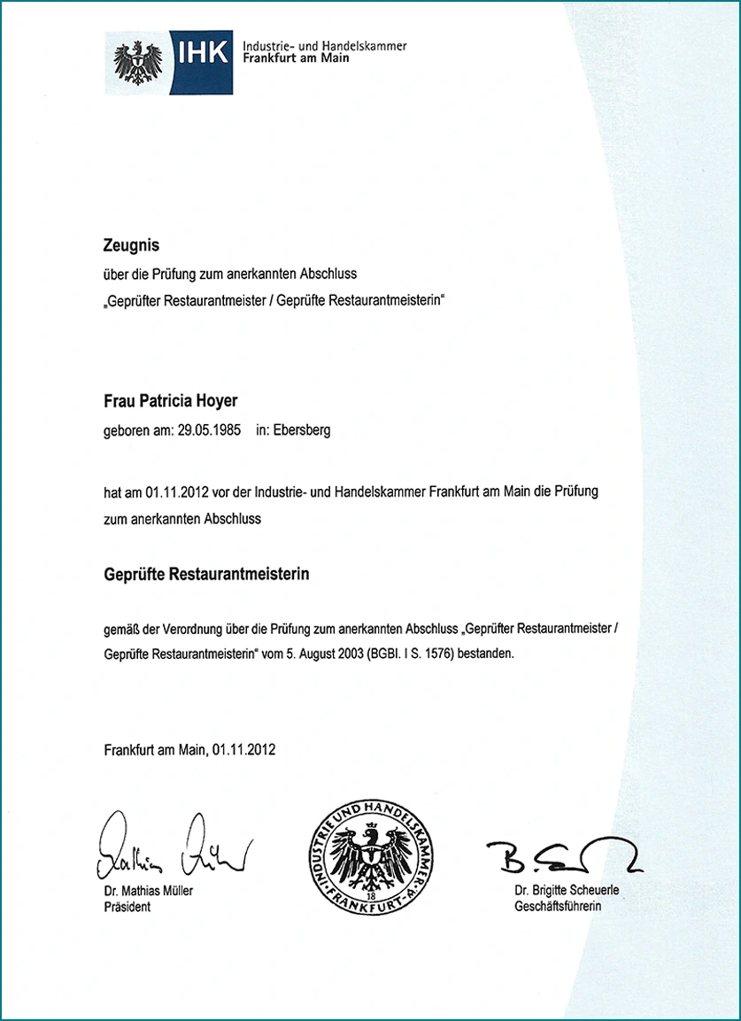 2012: Fernstudium zur Restaurantmeisterin IHK in Frankfurt am Main